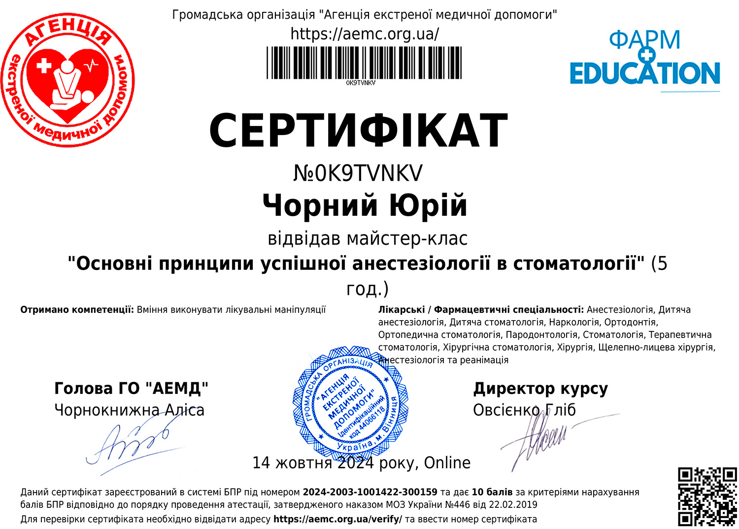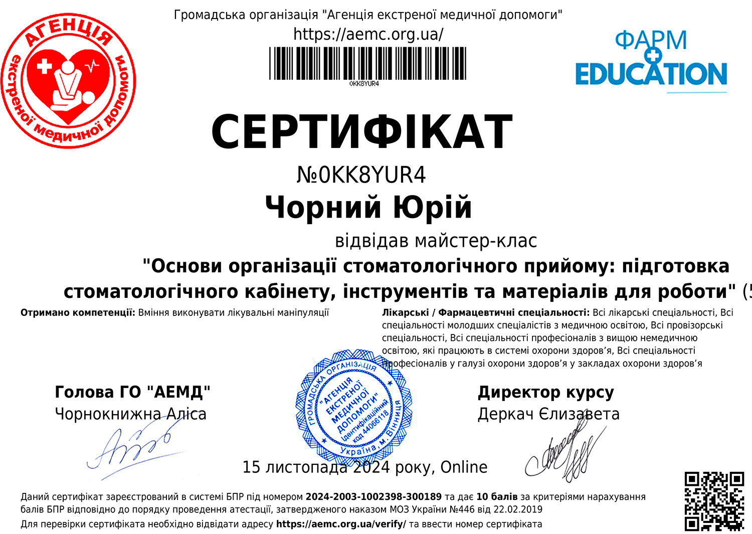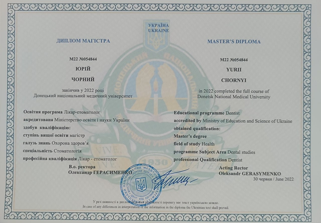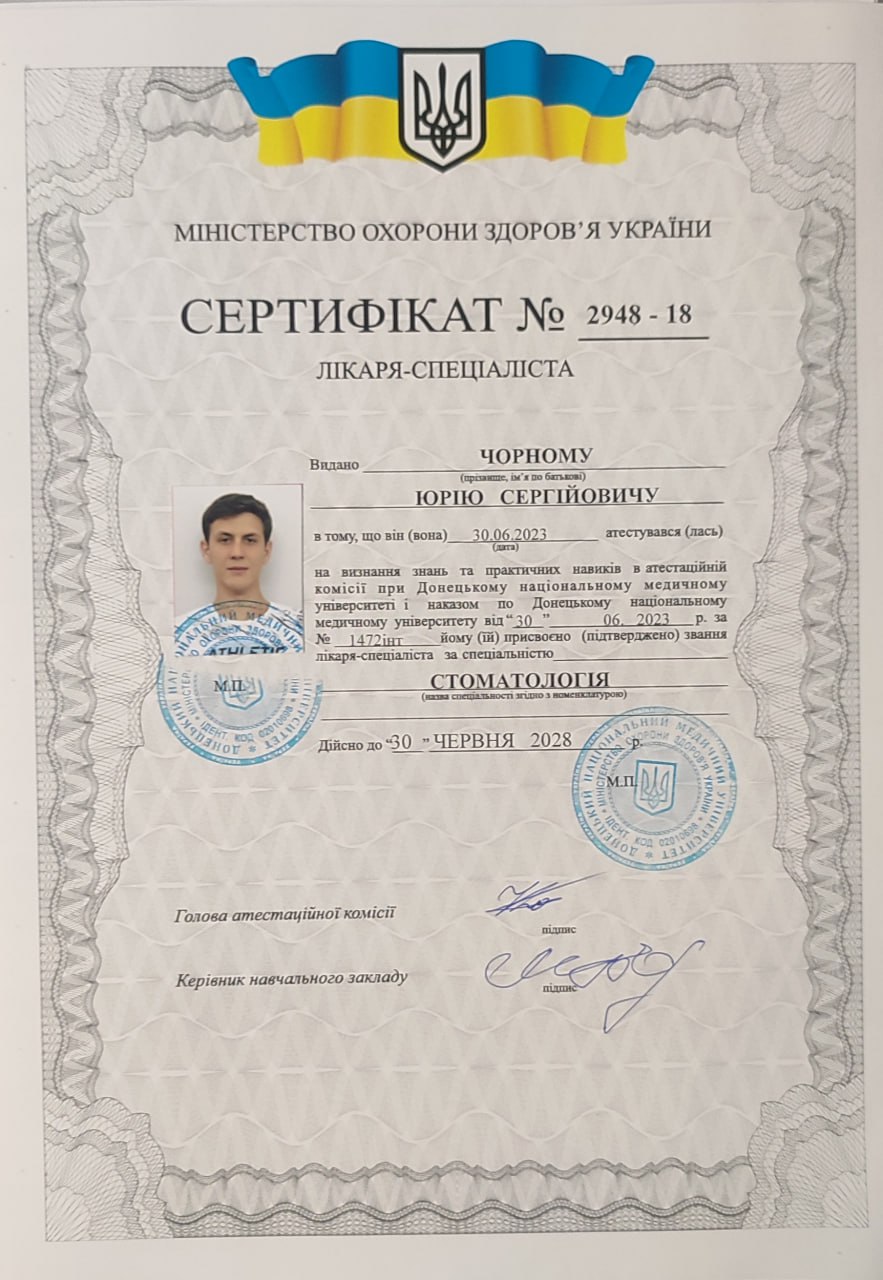 Пройшов навчання в Академії безперервної освіти професора Інесси Якубової на тему: "Карієс зубів та його ускладнення: місцеві анестетики, іригація каналів, перфорації, мікронутрієнти, травми зубів, прямі реставрації, адгезивні системи: доказово, практично, доступно
