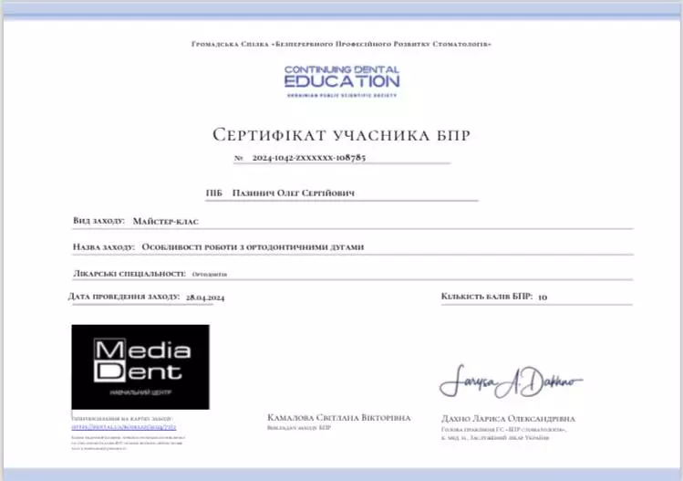 Цикл тематичного удосконалення «Комплекс стоматологічних дій при порушеннях прикусу». Полтавський державний медичний університет.